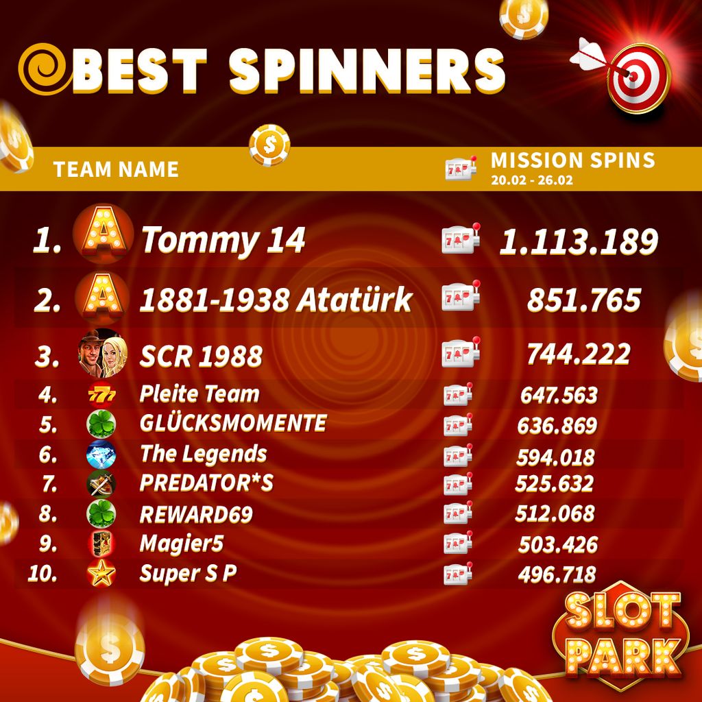 Competition Dates: 20.02-26.02 The Top 10 Teams with the highest number of Team Missions Spins are rewarded with a well-deserved bonus! Congratulations to all participating teams! It's easy to take part! 1. Spin as much as possible in Team Missions 2. Check the rankings every Friday 3. Be the …