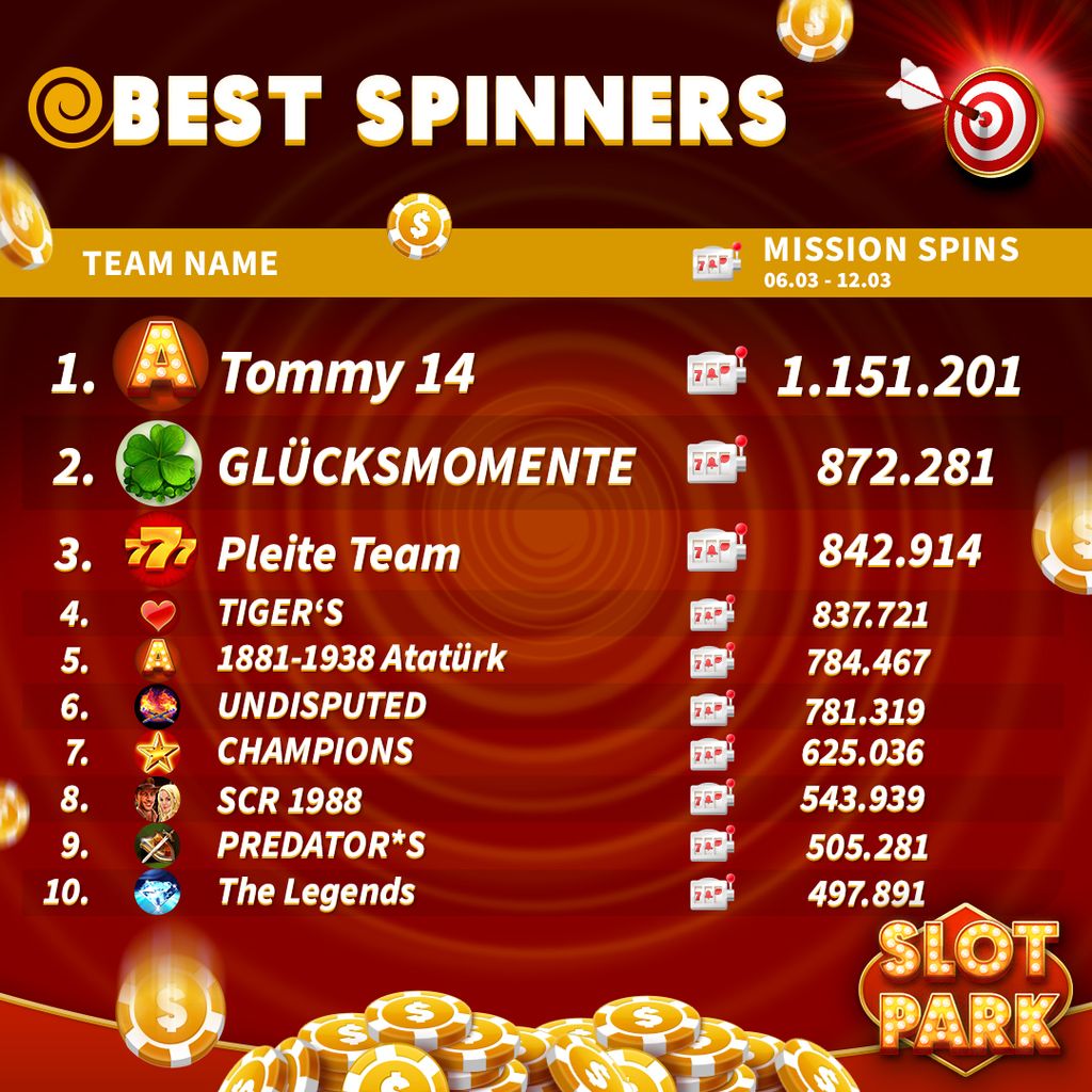 Mission Spins 1 Tommy 14 1,151,201 2 🌟 ƓȴüƇƘⳜ𐒄Ⱉ𐒄ƸƝƬƸ🍀 872,281 3 Pleite 😝Team 842,914 4 ᵂᵢᴸᴅ❤️TIGER'S🐅 837,721 5 1881-1938